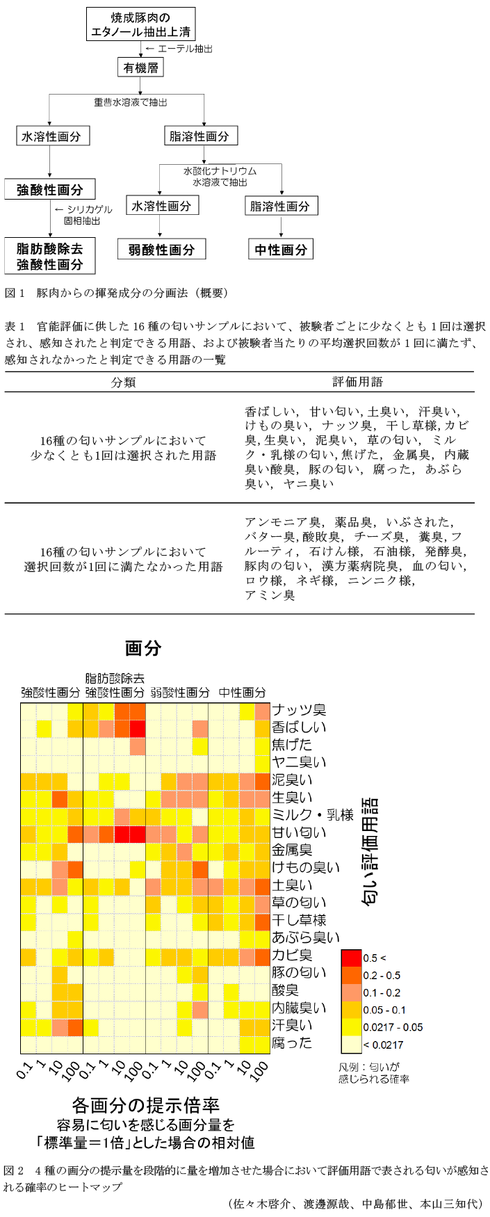 焼成した豚肉から抽出した揮発成分を液性に基づき分画すると、どの画分も「豚肉らしい匂い」を呈さない。「豚肉らしい匂い」の発現には単一の分画に含まれる成分だけでは不足である。