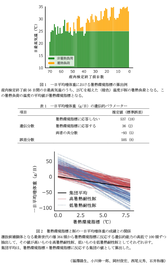 - 一日平均増体重において暑熱環境指標に反応する遺伝的能力と、反応しない遺伝的能力の遺伝相関は負の関係のため、暑熱耐性の改良にあたってはそのバランスに留意が必要である。