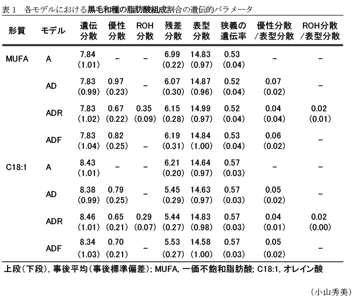 - 黒毛和種の脂肪酸組成割合は、表型分散に占める相加的遺伝分散(狭義の遺伝率)および優性遺伝分散の割合が高いため、遺伝的能力評価には、相加的遺伝効果だけでなく優性遺伝効果も大きく影響する(表1)。