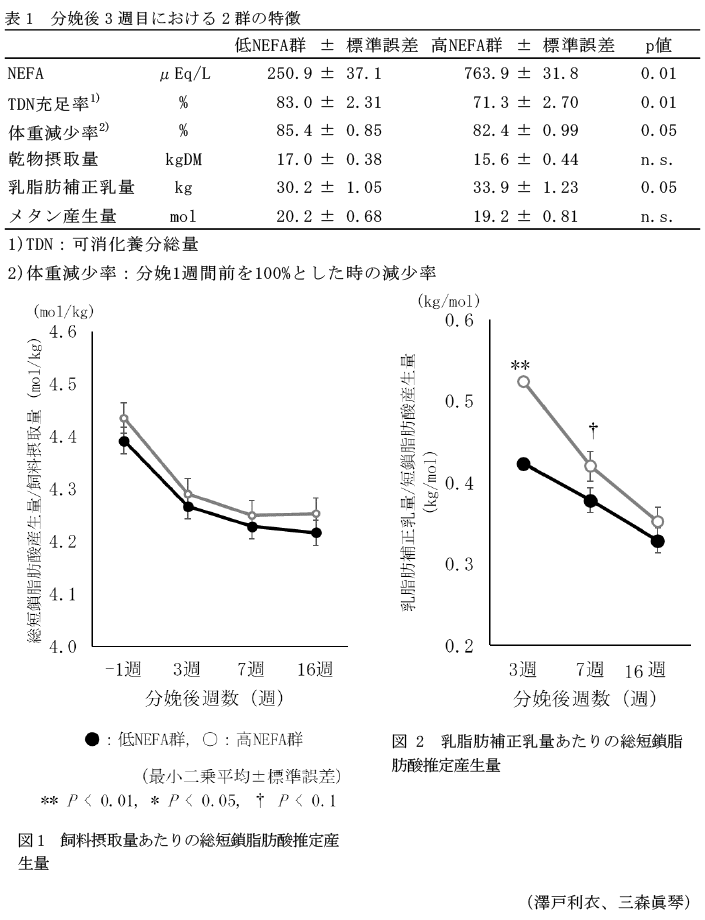 - 分娩後3週目の初産牛52頭を、血中遊離脂肪酸(NEFA)濃度の高低で2群に分ける。低NEFA群および高NEFA群の血中NEFA濃度は、それぞれ250.9μEq/Lおよび763.9μEq/Lである(表1)。可消化養分総量(TDN)充足率および体重減少率が、高NEFA群で低NEFA群より有意に低いことから、高NEFA群の方が相対的に強い負のエネルギーバランス状態であると推測される。