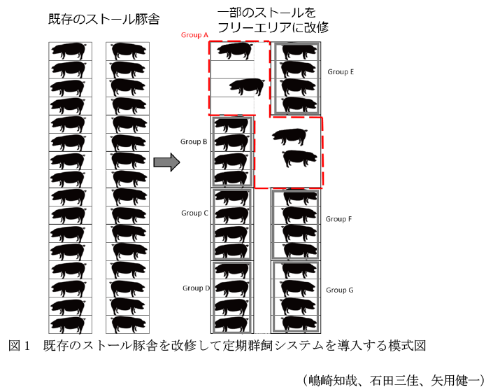 - 本研究で考案した飼養管理方法は、従来豚舎に導入されているストールの一部を取り払うことで、群飼に必要なスペースを設け、日または時間帯ごとに異なる小規模グループで群飼を行うものである。