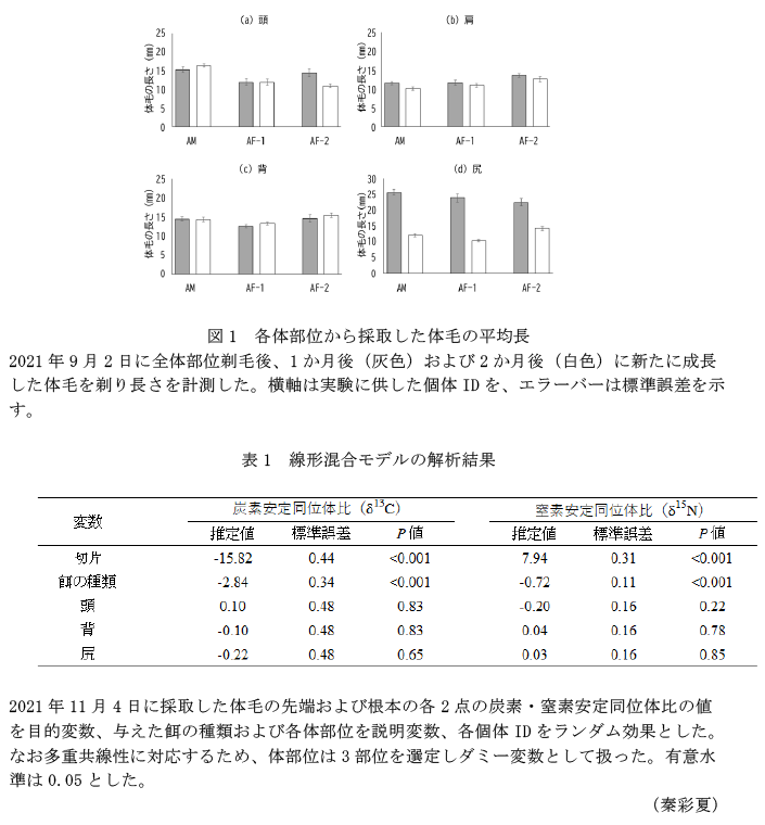 - 冬毛の成長期間中に採食した食物情報は冬毛の炭素・窒素安定同位体比に反映されるが(表1)、背と尻の冬毛に反映される速度はやや遅い。