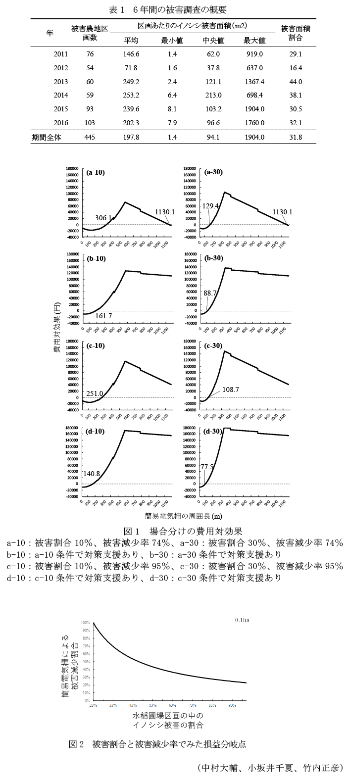 そこで、本研究ではイノシシによる被害量および対策による被害減少量を6年間追跡調査した千葉県安房地域の1,192区画の水田圃場を対象に、被害対策にかかる費用として資材費および労働費を計測することで、水稲圃場におけるイノシシ対策としての簡易電気柵の費用対効果を明らかにする。通常、収益性の低い作物の保護や小規模圃場は費用対効果で不利になるため、そういった条件下で実証をおこなったことに意義がある。