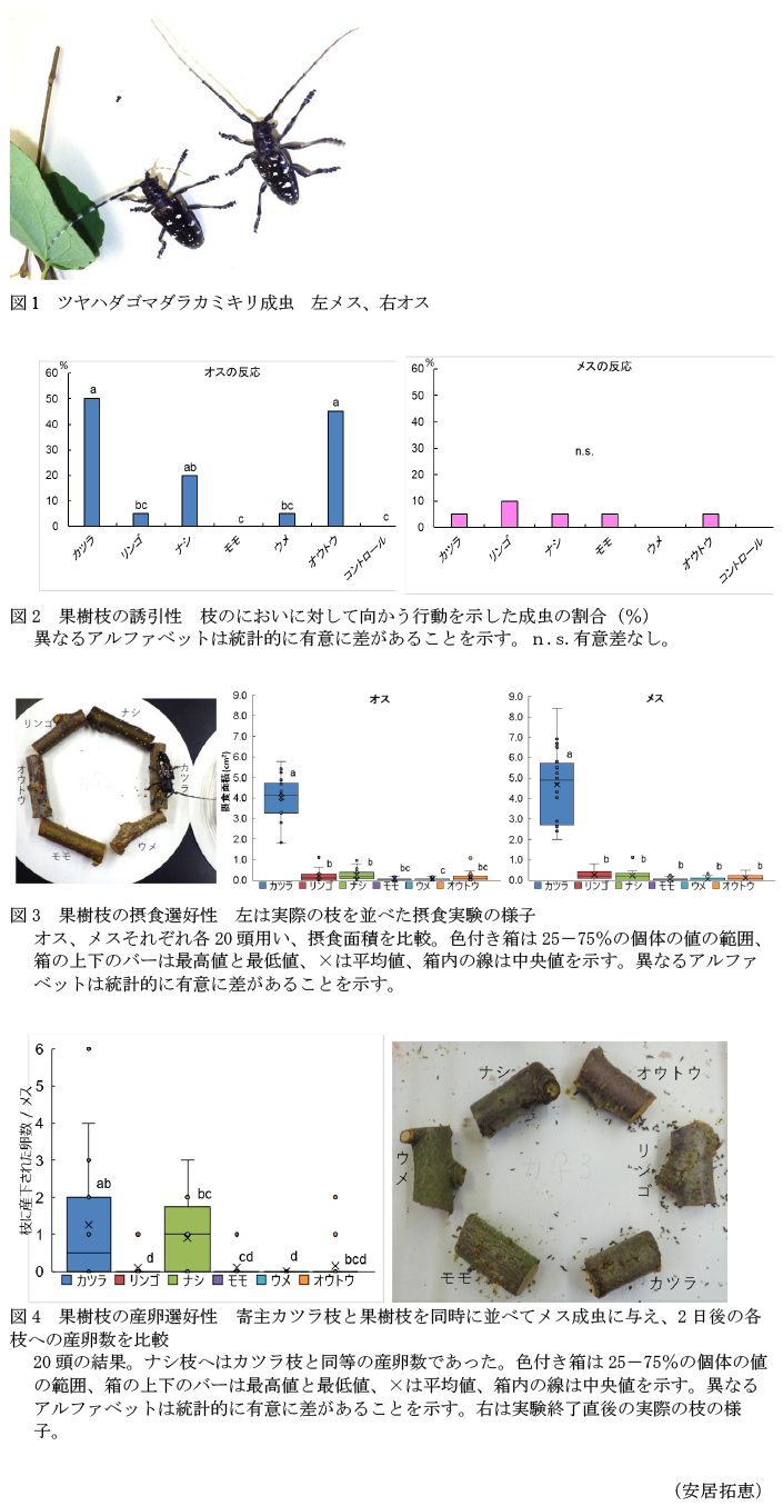 - 摂食選好性の生物検定では、寄主カツラ枝と果樹枝を同時に並べて成虫に与え、24時間後の各枝への摂食面積を比較する。摂食選好性の生物検定の結果では、いずれの果樹枝も摂食が確認できるが摂食量は少なく、その選好性はカツラ枝に比べ有意に低い(図3)。