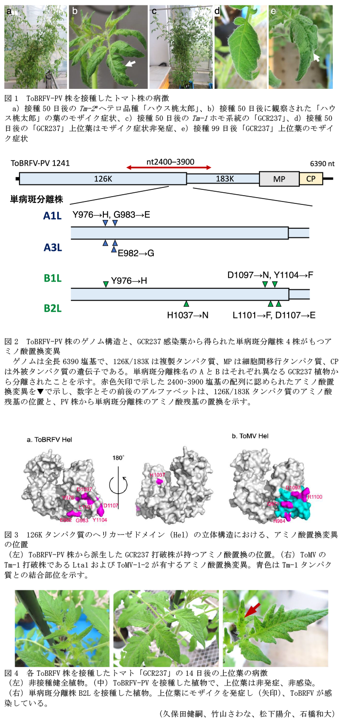 トマト等の重要病原体であるトバモウイルスのtomato brown rugose fruit virusに対して、抵抗性遺伝子Tm-1をホモで有するトマト系統は一時的には抵抗性を示すが、接種後数ヶ月が経過すると、Tm-1打破能を獲得したウイルス変異株が容易に出現する。