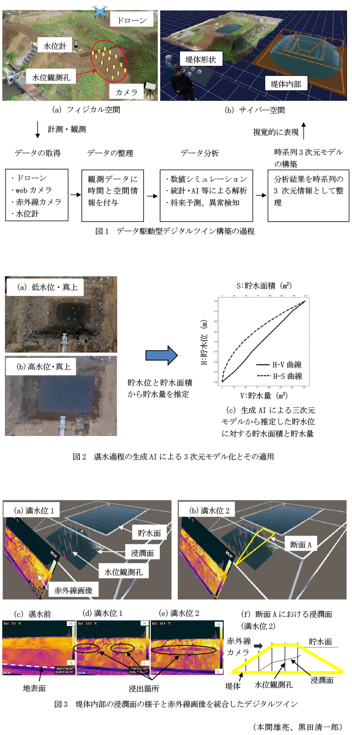 - 観測データは取得した位置と時刻に紐づけて保存され、3次元の空間座標と時間情報を加えた4次元データとして整理される(図1)。数値シミュレーションやAI、統計解析等を利用した分析を行うことで、堤体内部の浸透現象の将来予測や異常検知に活用することができる。
