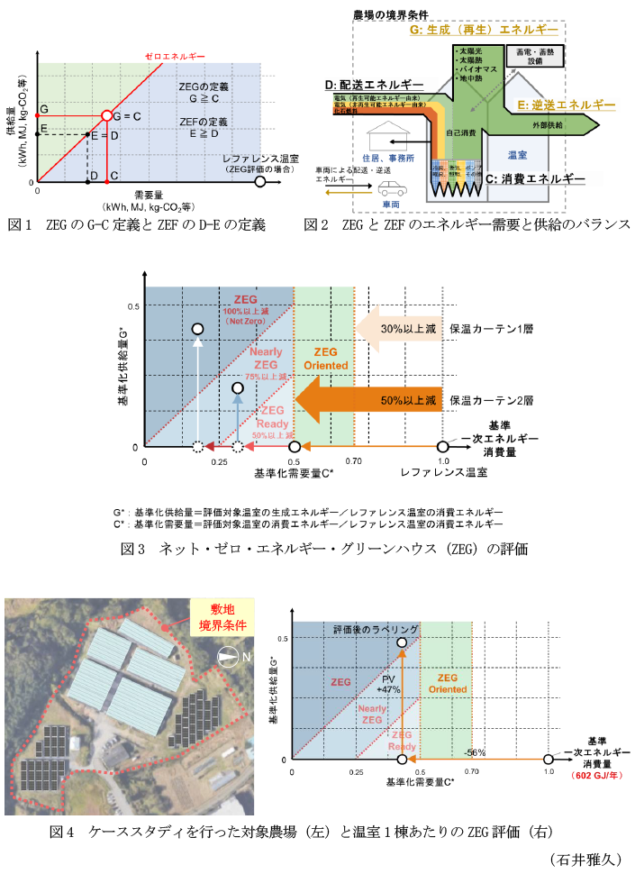 ここで、G*:基準化供給量=評価対象温室の生成エネルギー/レファレンス温室の消費エネルギー、C*:基準化需要量=評価対象温室の消費エネルギー/レファレンス温室の消費エネルギーである。被覆資材が外皮固定1重の温室に対し、室内に保温被覆を1層追加すると放熱量が約3割削減、2層追加すると約5割削減されることから、(C*-G*)が0.7以下の場合をZEG Oriented、0.5以下をZEG Ready、0.25以下をNearly ZEG、0以下をZEGの基準とする。