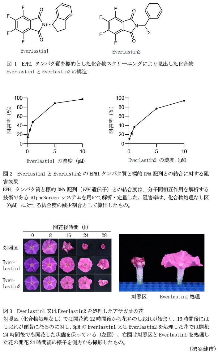 - Everlastin1とEverlastin2は、アサガオ花弁の老化を制御する転写因子であるEPH1タンパク質を標的とした化合物スクリーニングにより見出した化合物である(図1)。