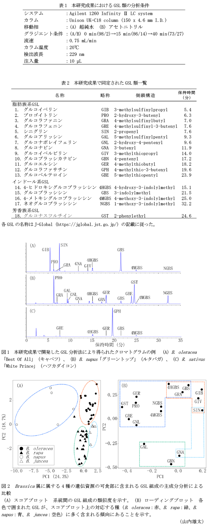 - Brassica属に属する4種(●:B. oleracea, ▲:B. rapa, 〇:B. napus, △:B. juncea)の遺伝資源の可食部のGSL組成に対して主成分分析を行い、スコアプロット(図2A)とローディングプロット(図2B)を作成することで、系統間のGSL組成の類似度と、第1主成分(PC1)、第2主成分(PC2)に対する各GSLの寄与を可視化することができる。今回使用したBrassica属4種は、得られたPC1とPC2によってスコアプロット上で分類されるため、これらのGSL組成には明確な違いがあることがわかる。