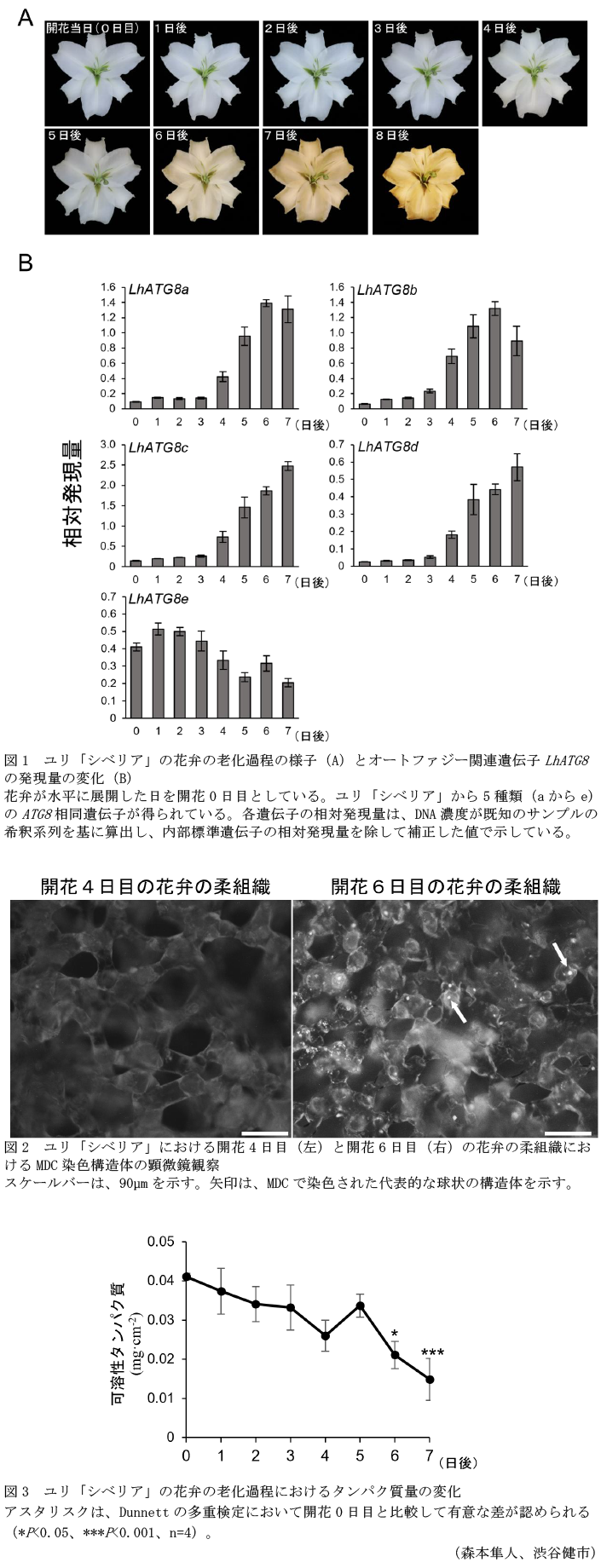 - これらの結果は、エチレン非依存性花きであるユリにおいても、花弁の老化時にオートファジー関連遺伝子の発現が誘導され、オートファゴソーム等の酸性小胞の形成に伴うタンパク質の分解といった一連のオートファジー様プロセスが誘導されることを示唆している。