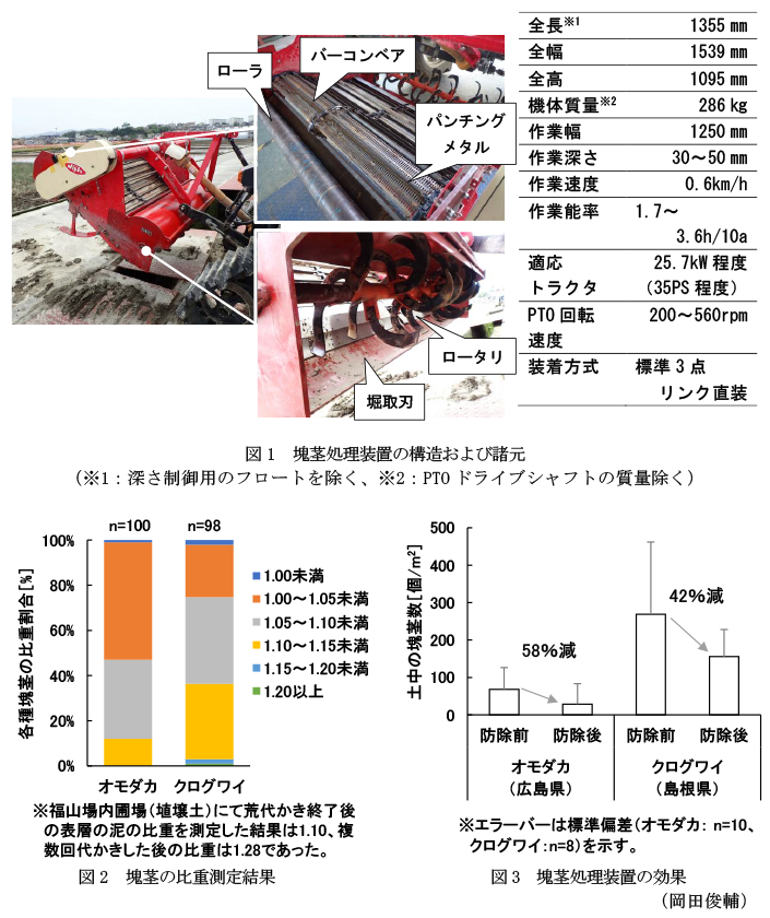 - 本装置による防除効果(作業前後の塊茎埋没数の比較)は、現地のオモダカ多発圃場(広島県A町、17.9a)では約6割、場内のクログワイ多発圃場(島根県B市、2.5a)では約4割である(図3)。なお、現地と場内の作業速度はともに0.6km/h、作業能率は前者が1.7時間/10a、後者は3.6時間/10aである。