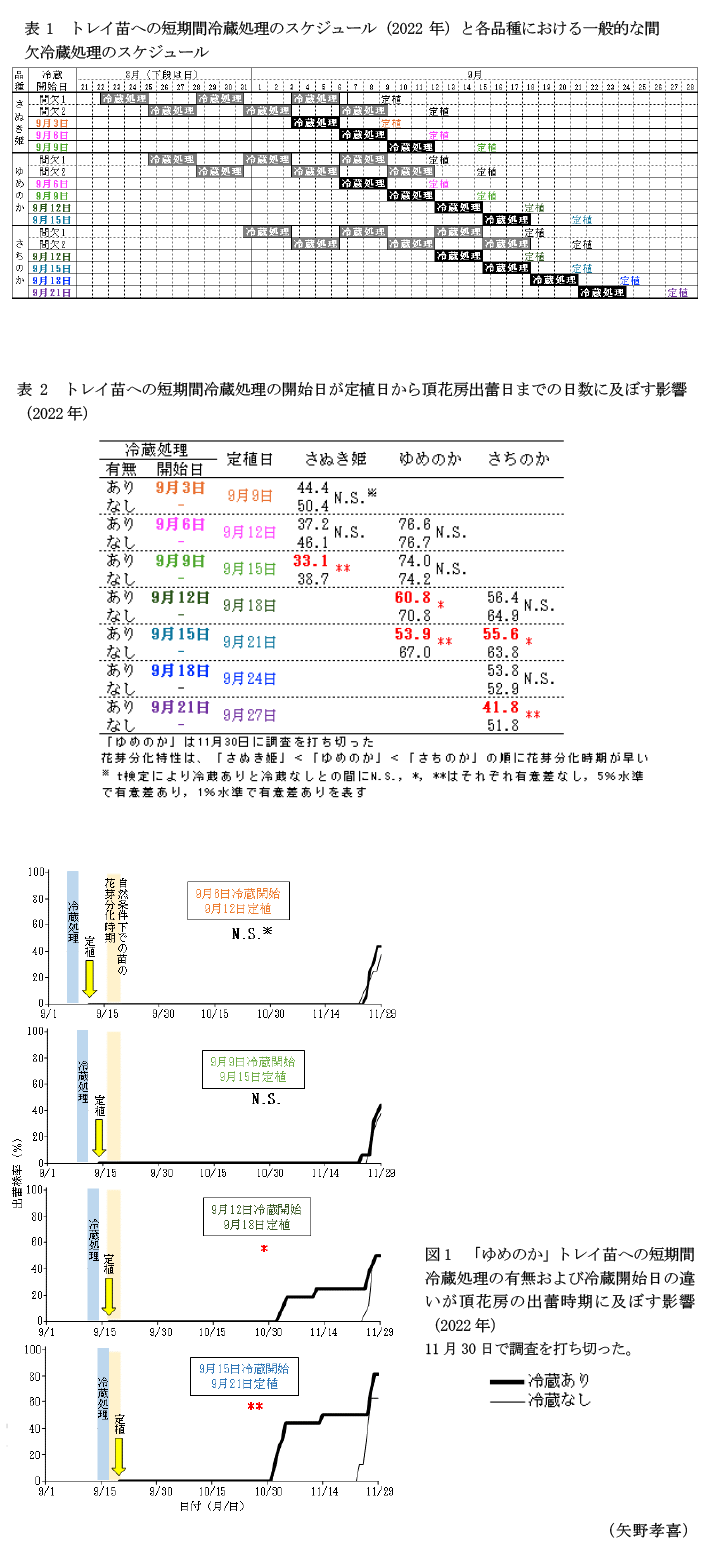 そこで、本研究では育苗が省力的なトレイ苗を用いて、花芽分化特性の異なる複数品種の苗に短期間の冷蔵処理を実施して花芽分化を促進する処理方法・処理条件を明らかにする。