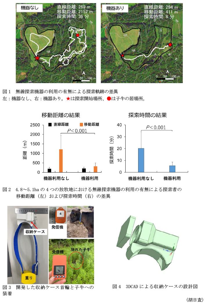 - 4.8~5.1haの4つの中山間地域の放牧地において、機器の有無で子牛の探索時間と探索距離を比較すると、機器なしの探索では、発見まで平均1,217mの移動で20分の時間がかかる。一方、機器ありの探索では、平均320mの移動で6分の時間で発見可能である(図1、図2)。無線探索機を利用することで、探索者の移動距離と探索時間が有意に短縮される。無線探索機による検出範囲は、障害物等が無い場合、1000mである。