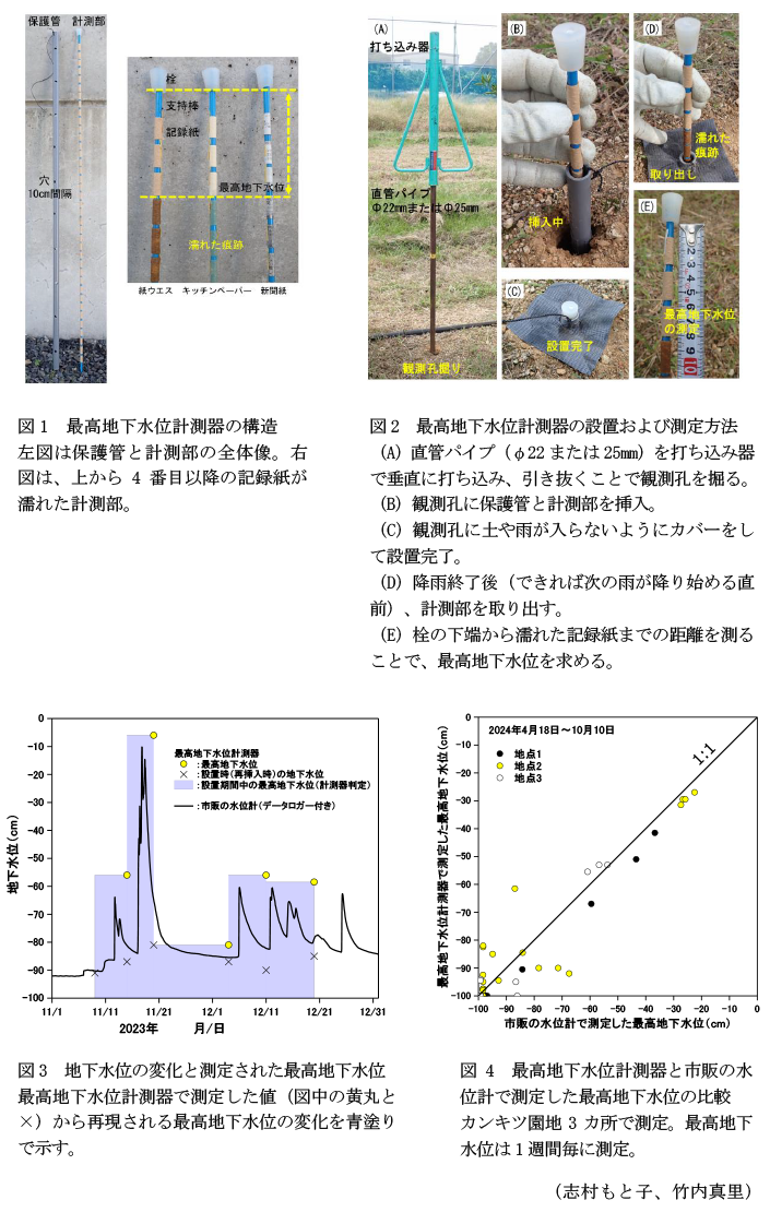- 最高地下水位計測器は、保護管と計測部によって構成される(図1左)。保護管は、地下水位を測定する穴(観測孔)が崩れるのを防ぐ。計測部は栓、支持棒、記録紙から構成される。記録紙は地下水に浸かると濡れ、色合いが変化する。地中では濡れた状態が維持されるため、栓の下端(地表面に位置)から濡れた記録紙までの距離を測ることで、設置期間中の最高地下水位が求まる(図1右)。