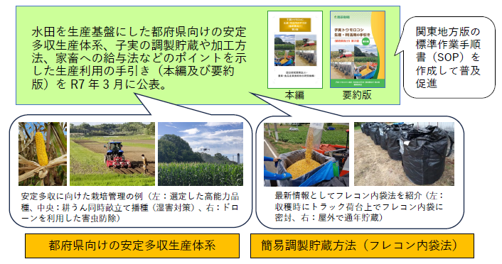- 大学や公設試などと連携し、これら水田転換畑等で子実トウモロコシを安定多収生産する技術体系(目標収量900kg/10aを達成)を取りまとめ、R7年3月に「子実トウモロコシ生産・利活用の手引き(都府県向け)第2版」を公表しました。