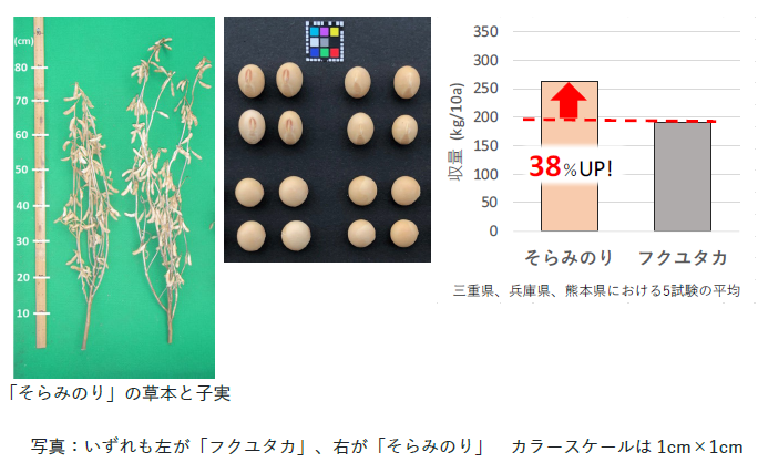 ダイズは豆腐、味噌、納豆など日本の伝統的な食品に加工される重要な作物ですが、2024年の日本国内の単収は164kg/10aで、米国の単収(341kg/10a)の半分程度に留まっています。一方、米国品種は主に搾油用として育成されており、国産ダイズの主用途である豆腐の加工適性に影響を及ぼすタンパク質含有率が一般的に低い傾向にあります。そのため、日本品種が有する優れた豆腐等への加工適性と米国品種が有する多収性を兼ね備えた品種の育成が国内において求められていました。農研機構では、豆腐等の加工適性に優れた日本の系統と米国の極多収品種を交配し、選抜を行って新品種「そらみのり」を育成しました。
