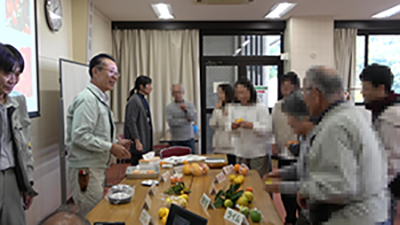 講義では、この時期に入手可能な中晩生のカンキツを実際に見て・触れて、糖度・酸度測定や試食をしました。私達がよく口にする「うんしゅうみかん」は種子ができないため、「枝変わり(突然変異)」の枝を見つけて品種改良せざるを得ないこと、種子ができる中晩生かんきつ類では、種子を播いて食卓に届くまで20年を超える年月が必要なこと、また近年では、光センサーの導入により糖度の揃った商品が食卓に届いていること、このほか、お店で売られているミカンの中からより美味しいミカンを選ぶ方法などをお話しし、クイズも交えて研究者と参加者が交流を行いました。