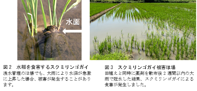 - スクミリンゴガイ(図2)は1981年に食用目的で日本に導入されましたが、養殖業者の廃業等によって野生化しました。水稲への食害被害は、田植え後約2週間の間に水深4cm以上となる条件下で発生しやすく、主に九州などの生息地域では、水深1cm程度の浅水管理や落水管理(図3)、田植えと同時の薬剤散布等が行われています。