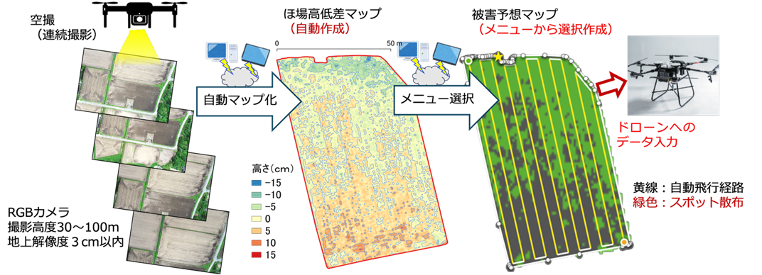 スクミリンゴガイによる被害は、水深が4cm以上となる比較的低いエリアで発生しやすくなります。ドローンによる薬剤散布は省力的な手法ですが、ほ場全体に散布すると薬剤の使用量が多くなるため、水深が深くなりやすい低いエリアを特定する被害予測マップを作成し、必要な場所にのみ散布する技術が求められていました。しかし、被害予測マップの作成には、予測アルゴリズムの開発や空撮画像のマップ化に関する専門的な知識が必要です。