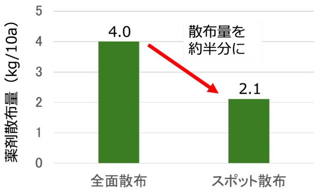 - ほ場における実証試験では、スポット散布により薬剤使用量は平均47%削減されました(図5、2023年)。なお、薬剤を全面散布したほ場と、被害エリアのみスポット散布(散布量45%減)したほ場の被害面積を比較した試験では、いずれも被害を10%以下に抑制できました(2024年)。