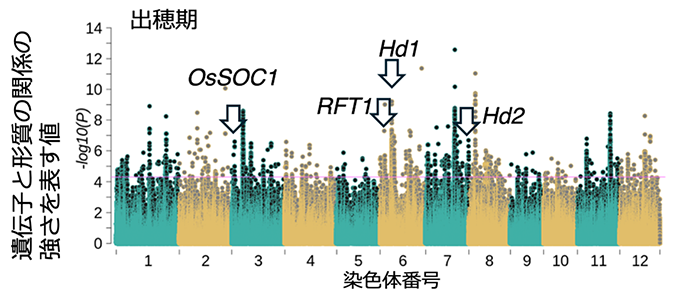 図2. 出穂関連遺伝子のゲノムワイド関連解析 (GWAS)結果