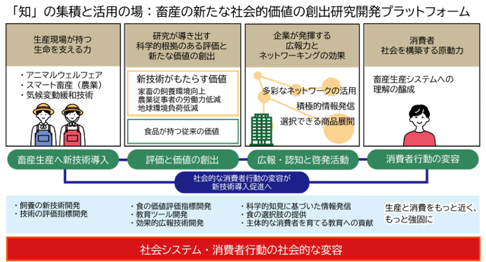そこで、本プラットフォームでは、生産者と消費者の距離をもっと近く、強固にすることを目指します。社会システム・消費者行動7)の社会的変容を目標と定め、生産から消費に至るまでを分野横断的に研究グループと企業が協働し、畜産物の新たな価値を創出します。また教育活動など様々な取り組みを通して、創出された新しい価値の消費者への認知と啓発活動を行います。