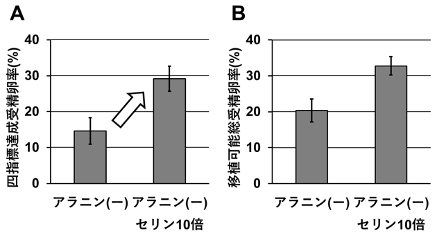 次に、アラニン非添加培養液に対して、非添加により四指標達成受精卵率に変化がなかったセリンの適切な添加濃度の検討を行いました。するとセリンを通常の10倍濃度(1 mM)で添加することで、四指標達成受精卵率が向上することを見出しました(図4 A)。また、移植可能総受精卵率はセリン10倍濃度添加によって増加傾向にあるものの、有意な差は見られませんでした(図4 B)。
