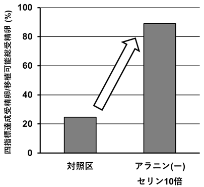 さらに、アラニン非添加とセリン10倍濃度添加を組み合わせた培養液では、移植可能総受精卵に占める四指標達成受精卵の割合が、対照区の25%から90%へと改善されました(図5 )。