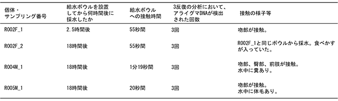 表1 飼育ケージ内の給水ボウルにアライグマが触れた時間とアライグマ由来のDNAの検出有無