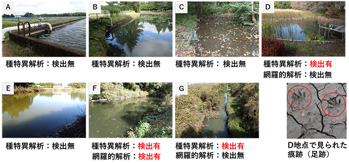 種特異解析で検出ができた地点において網羅的解析を行いました。アライグマの痕跡が認められた地点Dに加え、痕跡が確認されなかった地点F、Gにおいて、今回開発したアライグマに特異的な検出法でのみアライグマDNAが検出できました。地点Fでのみ、網羅的解析および今回開発したアライグマの種特異解析の両方で検出されました。