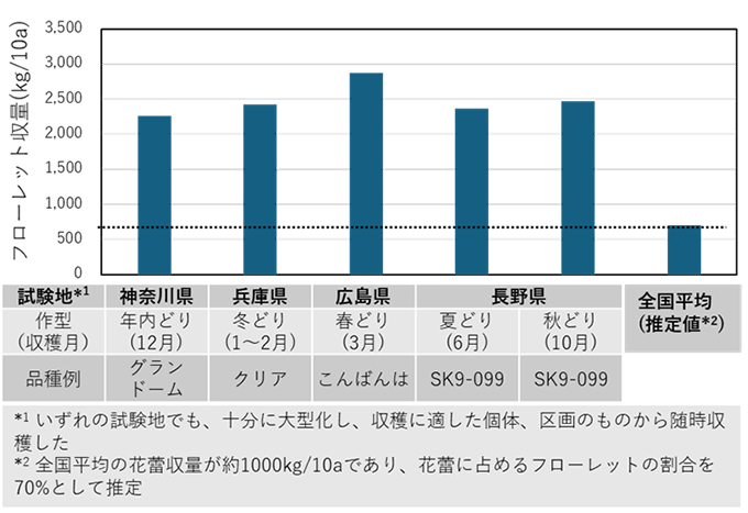秋作から春作にかけての産地では「グランドーム」、「クリア」、「こんばんは」などの品種、夏作産地では「SK9-099」などの品種で高い収量が得られました。適切な品種を栽培することで、7県のいずれにおいても全国平均の3倍以上となるフローレット収量(2,100kg以上/10a)が達成可能であることが確認されました(図2 )。ただし、慣行的な栽培方法と比較して栽培期間が延長する傾向にあり、例えば長野県の夏どり作型では約1週間の延長が必要となります。