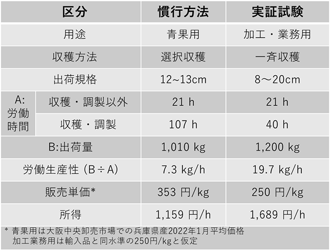 表1 大型花蕾生産技術による加工・業務用ブロッコリー生産実証試験の経営評価