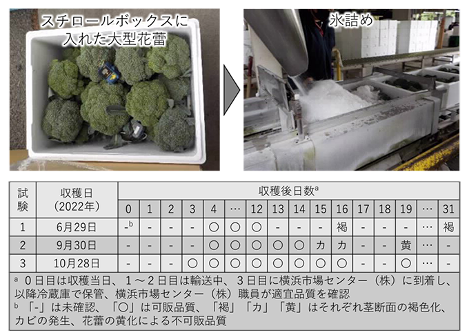 6月~10月に長野県の現地ほ場で収穫した大型花蕾をスチロールボックスに氷詰めし、約3日間かけて神奈川県に冷蔵トラック便で輸送しました。その後5° Cの冷蔵庫で貯蔵した結果、収穫後12日間以上にわたって可販品質が保持されました。気温の高い夏秋作期に収穫された大型花蕾であっても、倉庫到着後1週間以上という実用上要求される日持ち性を十分に有していることが実証されました(図4 )。