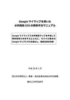 GIS(地理情報システム)を活用すると農業水利施設の管理の効率化を図ることができます。しかし、汎用型のGISソフトの場合、ある程度専門的な知識がないと操作方法をマスターするのは難しく、また特定業務用のGISソフトの場合でも、航空写真画像を入手してGISにセットするといった前準備は、専門家のサポートがなければ難しいのが実状であり、GISはまだ広く活用されてはいません。そこで、操作が簡単で、かつ、撮影時期の比較的新しい航空写真画像がオンラインで利用できるGoogleマイマップ(Google社)に着目し、土地改良区(公益法人)の職員がGoogleマイマップを用いて水利施設GISを構築できるように、本マニュアルを作成しました。水利施設マップという「地図」の作成・共有やモバイル端末での利用の手順などが記載されています。