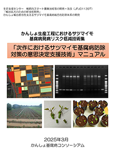 「戦略的スマート農業技術等の開発・改良(令和4年度~令和6年度)」(JPJ011397)で実施されたサツマイモ基腐病総合防除体系に関する技術開発の成果として、かんしょの各生産工程で実証された有効な防除対策技術や、次作の本圃での防除意思決定に役立つ発病ポテンシャル診断技術などを、計3冊の技術マニュアルから成る技術集として取りまとめました。 本冊子は、かんしょの種苗生産工程における健全種苗の生産・供給につながる技術マニュアルであり、苗床の消毒技術や、苗および種イモの消毒技術、茎頂培養苗の生産工程管理法の他に、苗の育成工程中での基腐病発生の際の原因究明と再発防止に役立つかんしょ種苗の多検体検査法などについて解説しています。 |