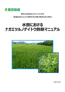 本州以南の水田地帯で問題化しているナガエツルノゲイトウを対象に、農林水産省委託プロジェクト研究「平成31年度 戦略的プロジェクト研究推進事業 野生鳥獣及び病害虫等被害対応技術の開発」(JPJ007966)において、農地への侵入防止技術および侵入後の防除技術の開発に取り組み、防除マニュアルとして取りまとめたものです。本マニュアルでは、(1)ナガエツルノゲイトウ対策が必要な背景、(2)水田および(3)水田畦畔におけるナガエツルノゲイトウの防除技術について、実証事例を交えながら普及指導員や営農指導員、生産者向けに詳しく解説しています。 |