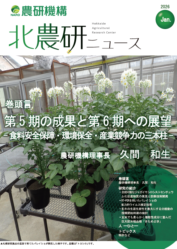 研究の紹介・合成可能なジャガイモシロシストセンチュウふ化促進物質の発見と防除技術開発・RT-PCRを用いたバレイショの省力的ウイルス検定技術・乳牛の生涯生産性を最大にする分娩後の授精開始時期の検討・玄米でも柔らかく機能性成分に富んだ 巨大胚水稲品種「きためぶき」