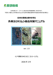 生研支援センター「イノベーション創出強化研究推進事業(2022~2025年度)」(JPJ007097)「相次いで侵入した外来カミキリムシから日本の果樹と樹木を守る総合対策手法の確立」の成果を中心に、外来カミキリムシ3種(クビアカツヤカミキリ、ツヤハダゴマダラカミキリ、サビイロクワカミキリ)への対策を取りまとめたものです。特にバラ科果樹(モモ、ウメ、スモモ等)での防除対策の企画・調整を担う地方公共団体や関係機関の活用を想定し、3種に共通する基本的な考え方と、種ごとの具体的な防除技術として現場で実装可能な物理的防除技術や診断技術、情報共有の取組事例等、を整理しました。 |