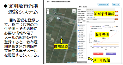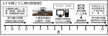 イネ稲こうじ病に対して、土壌改良資材と薬剤散布適期連絡システムを基本とした、総合防除技術を開発した。 土壌改良資材により土壌中に菌が生き残りにくい環境を構築する。さらに、電子メールでパソコンやスマートフォンを利用して農薬散布適期情報を配信することにより適期防除を支援できる。発生量が多いと判断された場合は、病粒除去の要否の判断支援も可能である。 ![]() |