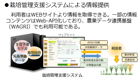 生育状況や気象状況に応じた適期防除の判断紋枯病や稲こうじ病などの発生を予測し、被害を軽減するための情報が提示される。 早期警戒情報による農業気象災害を軽減高・低温情報やフェーン注意情報など異常気象に関する情報により早めの対策を行うことが可能になる。 適期管理・施肥量のアドバイスを提供作物の発育ステージに応じた栽培管理が可能になり、追肥の施用適期や施肥量が算出される。 |