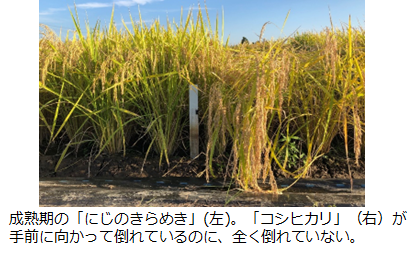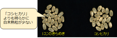水稲の玄米外観品質は、登熟期である夏の気温が高い場合には白未熟粒が発生して低下し易い。「にじのきらめき」は夏の気温が高い年にも玄米外観品質が低下しにくく、安定して良好である。また、「コシヒカリ」に比べて丈が短くて倒れにくく収穫量が多いので、収益性が高い。さらに、イネ縞葉枯病に対して抵抗性なので、縞葉枯病が発生しやすい麦作地帯への導入も容易である。 ![]() |