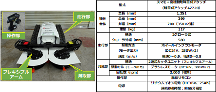 本機は、走行部、刈取部、操作部等から構成される電動式のリモコン草刈機で、1台で畦畔及び整備法面における草刈り作業が可能な高機動畦畔草刈機である。各部の電源はバッテリから供給され、走行部は走破性の高い一対のクローラ式で、刈取部は走行部の前側に位置する2連式のカッタユニット構造(回転刃)を採用している。畦畔作業時は、フレキシブルアームによって左右刈取部の位置を変更でき、刈取部が畦畔上面及び畦畔法面に適応できる。 ![]() |