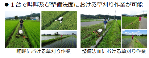 草刈り作業の軽労化及び安全性の向上が期待電動式のリモコン草刈機であるためGHG削減が期待でき、作業者は従来の自走式草刈機のようにハンドルを持って機体を支える必要がなく、作業者負担の大幅な軽減が期待できる。また、作業者はエンジンの振動、飛び石、塵、埃の影響や作業機の反発を受ける危険性が大幅に減少するため、作業の安全性向上(作業環境の改善)が期待できる。 |