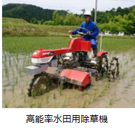 高能率水田用除草機は、除草剤を使用しない有機栽培での雑草対策の中核となる除草専用機である。本機は、3輪型乗用管理機の車体中央に、条間が駆動ローター式、株間が搖動ツース式の除草部を搭載している。除草作業中に運転席から稲列が確認しやすく、10a当たりの作業時間は20分~30分である。 高能率水田用除草機による除草作業を適期に行い、深水管理などの耕種的な雑草防除技術を組み合わせることで高い除草効果が得られる。これに加えて、いもち病や縞葉枯病などの抵抗性品種の利用、中~成苗の育成、適切な水管理、病害虫対策などにより、省力的で安定した収量が得られる有機栽培が可能である。 ![]() |