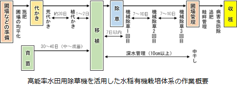 80%以上の雑草を除去可能高能率水田用除草機による2回~3回の除草作業と耕種的な雑草防除技術などの組み合わせにより、80%以上の雑草が除去できる。 収量は慣行栽培の9割程度3年間の現地試験の結果から、本有機栽培体系の導入により慣行栽培の約9割の玄米収量を得られることが示されている。生産コストは、慣行栽培の1.3倍程度となる。 |