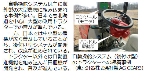 自動操舵システムはGNSS(衛星測位システム)によって自機位置を正確に把握し、あらかじめ作成した走行経路等に沿って走行するように、運転者に代わって操舵を行う。 操舵を代行させる目的は、少子・高齢化に伴う農業従事者の減少により、熟練運転者の確保が難しくなったため、運転操作に不慣れな運転者でも熟練運転者並みの作業を実現することにある。 また、熟練運転者は運転操作とともにトラクター等に装着した作業機(耕うんや農薬・肥料を散布する装置)の稼働状況を常に監視して作業の質を高めている。これを農作業に不慣れな運転者でも行えるようにする。 |