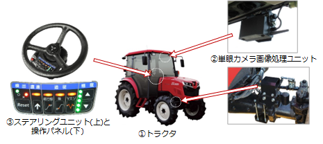 GPSを使わずに、カメラを使用することで低価格化を実現したトラクタの自動操舵装置。トラクタ1に下記2~4の機器を後付け装着する構成。前方の風景と地面を単レンズ眼カメラ1台で撮像し、その画像を画像処理ユニットで解析して最適な操舵角を計算し、ステアリングを自動制御する。 ![]() |