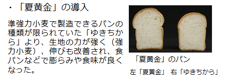 「夏黄金」は既存品種「ゆきちから」より1日程度早生で、赤かび病耐病性や穂発芽耐性を強化した寒冷地向け小麦新品種。製パン適性にも優れる。穂発芽性は「ゆきちから」の「中」より2ランク穂発芽耐性が強化された「難」、赤かび病耐病性は「ゆきちから」の「やや弱」の1ランク抵抗性が強い「中」で、「ゆきちから」の栽培上の欠点を改善。 また、「ゆきちから」より生地の力が強く製パン適性に優れ、多くの種類のパンを作ることができる。 |