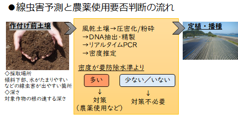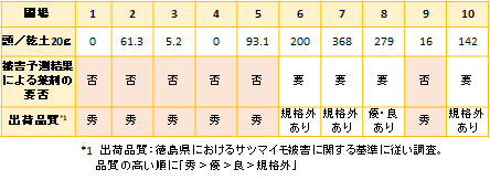 本技術は、分子生物学的手法を用いて、迅速かつ高精度に土壌中のサツマイモネコブセンチュウ密度を測定し、サツマイモへの被害程度を予測することで、農薬使用の要否を判断する技術である。 砂質土壌サツマイモ栽培圃場(徳島県北東部)において、本技術を用いて線虫害対策の農薬使用は不要と判断され、農薬を使用しなかった圃場の全てで、サツマイモの出荷品質が高いことを確認した(下表)。 ![]() |