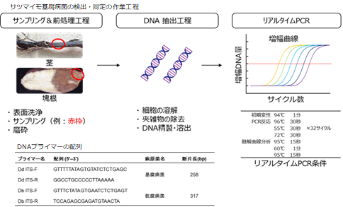サツマイモ基腐病は、サツマイモが病原菌に感染すると基部の黒変症状、葉の紫・黄化症状などを呈し、症状が進行すると枯死や土中で塊根の腐敗を引き起こし、深刻な被害をもたらす病害である。本病は国内未発生の病害であったため、迅速な診断ができなかった。 そこでリアルタイムPCRにより基腐病菌のDNAを検出し、基腐病菌の同定技術を開発した。この技術により迅速かつ信頼性の高い診断が可能となるので、本病への速やかな対策など、被害の拡大を防ぐことが可能となる。 ![]() |